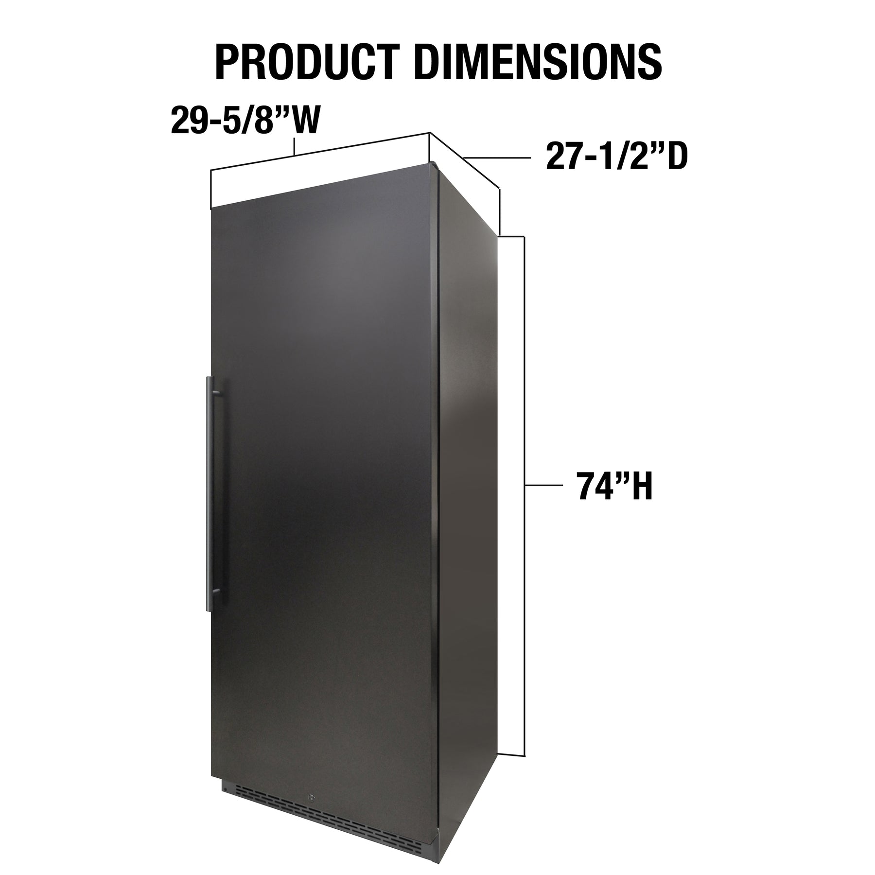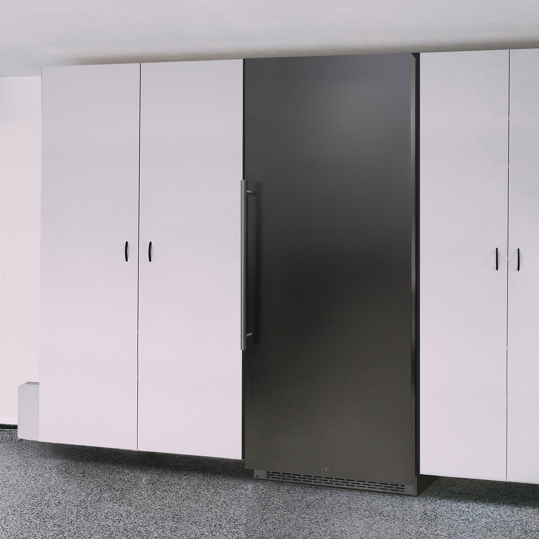 • Sleek black cabinet with a solid insulated, reversible door, and pole handle.